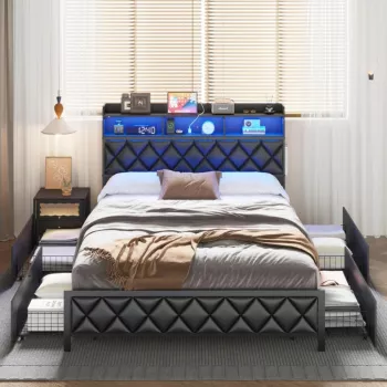 Queen Bed Frame with Storage Headboard, 4 Drawers, RGB LED, and Charging Station