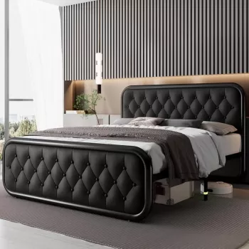 Queen Size Upholstered Bed Frame with Faux Leather Headboard