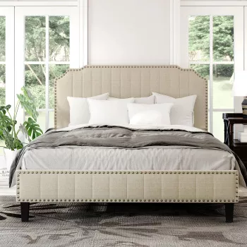 Modern Linen Upholstered Platform Bed with Nailhead Trim