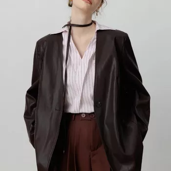 Women’s Loose PU Leather V-neck Jacket with Ribbon