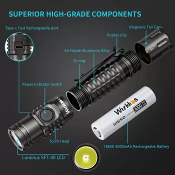 Rechargeable Tactical LED Flashlight – 2000lm, USB-C, IPX8 Waterproof, 18650 Battery