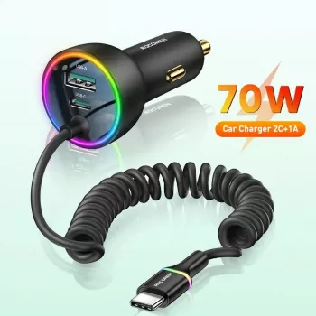 70W USB-C Car Charger with Fast-Charging Spring Cable