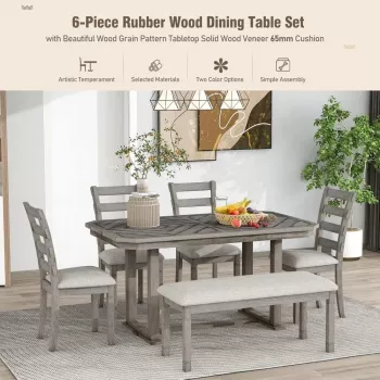 6-Piece Rubber Wood Dining Table Set with Cushioned Chairs and Bench