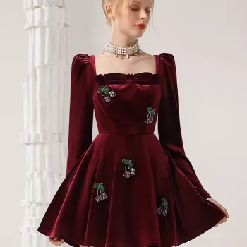 Elegant French Burgundy Velvet Long-Sleeve Banquet Dress for Autumn