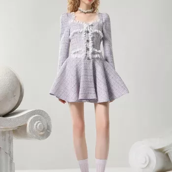 Elegant Purple Tweed Lace Mini Dress