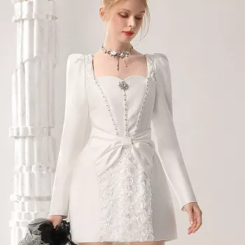 Romantic White Mini Dress with Bow and Square Neckline for Autumn Elegance