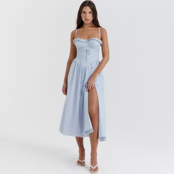 Elegant Summer Blue Crochet Midi Dress – Spaghetti Strap Bustier Party Dress