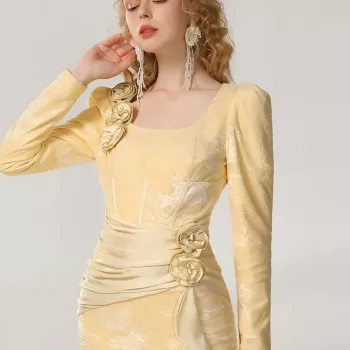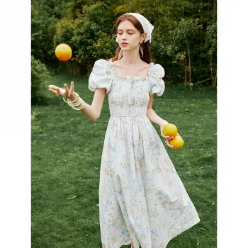 Elegant French Autumn Floral A-Line V-Neck Dress