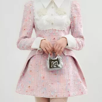Romantic Tweed Short Dress with Beaded Pink Floral Design