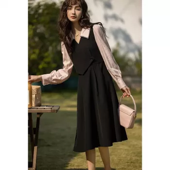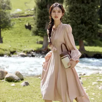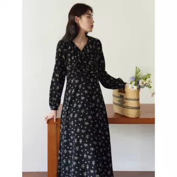 Floral Chiffon A-Line Dress with Lace-up V-Neck
