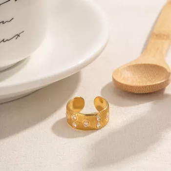 18K Gold-Plated Wide Face Striped Ring with Cubic Zirconia Inlay