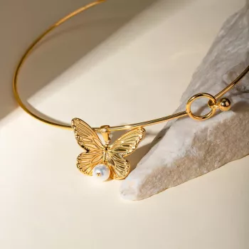 Elegant 18K PVD Plated Butterfly Pearl Pendant Choker Necklace