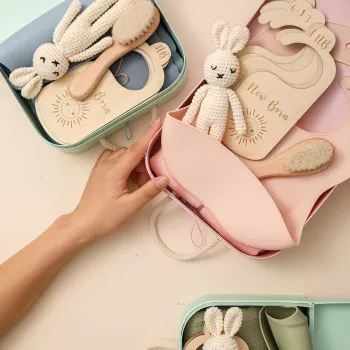 Baby Bath Gift Set – 100% Cotton Towel, Silicone Bib, Bath Brush & Bunny Puppet