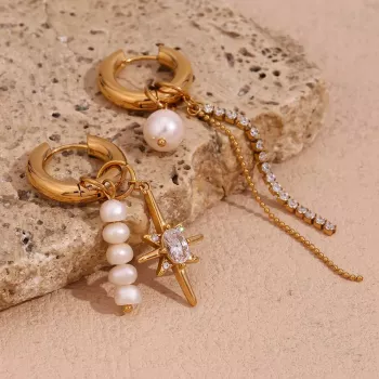 Asymmetric Freshwater Pearl and Zircon Star Chain Drop Earrings