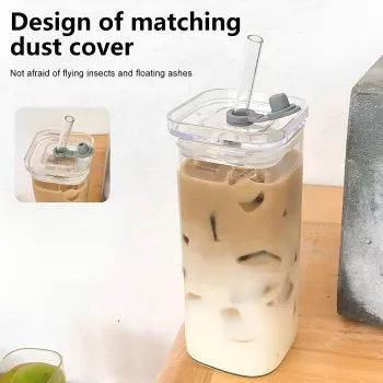 1/2Pc Square Heat Resistant Glass Coffee Mug with Lid and Straw