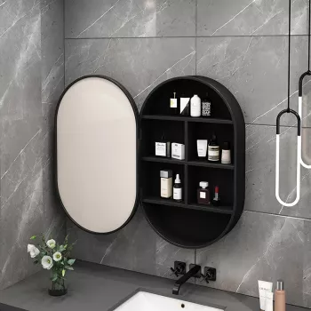 Modern Oval LED Illuminated Wooden Mirror Cabinet – Smart Bathroom Storage Solution