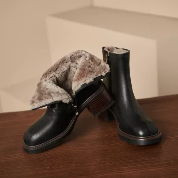 Winter Genuine Leather Ankle Boots for Women – Round Toe Warm Wool High Heel Zipper Boots