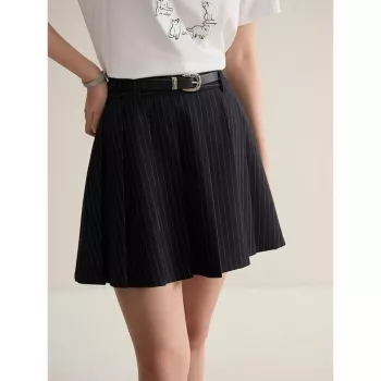 Black Stripe Mini Skirt – Casual Pleated A-Line with Wool Blend