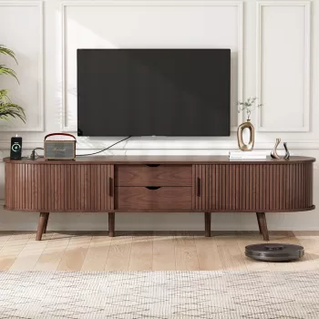 69″ Mid Century Modern TV Stand with Charging Station & Sliding Doors
