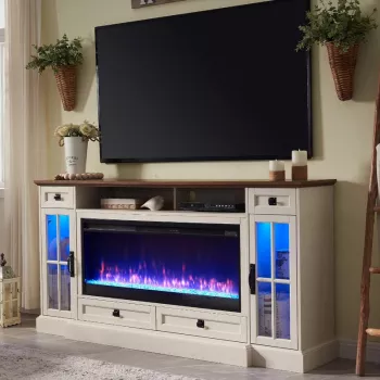 Farmhouse TV Stand with 42″ Electric Fireplace and LED Lights for 80-Inch TVs